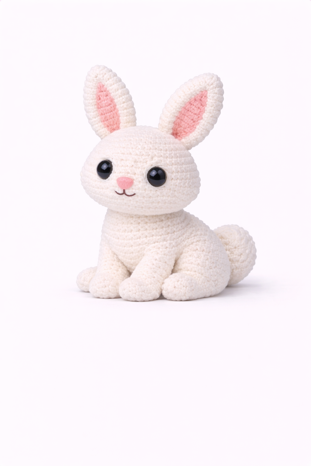 The finished bunny features long upright ears, a rounded body, gentle facial shaping, and a compact palm-sized form that fits perfectly in your hand. Its clean white colorway and calm expression make it ideal for baby gifts, nurseries, Easter décor, and timeless animal collections.